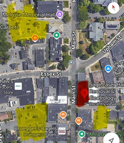 There is free street parking and there is also free public parking lots behind the buildings in downtown Melrose. The yellow areas on the map are the free lots you can park in and the red is the building that we are located in on the second floor.